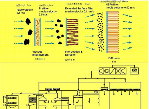 空調(diào)送風(fēng)系統(tǒng)通過(guò)一定的流速將灰塵送到過(guò)濾系統(tǒng)當(dāng)中,初級(jí)過(guò)濾器將5um以上大顆?;覊m留在過(guò)濾表 面,中效過(guò)濾器將1um-5um顆粒抓取,高效過(guò)濾器將0.3um-0.5um以上灰塵顆粒過(guò)濾,從而保證無(wú)塵車(chē)間等級(jí)!