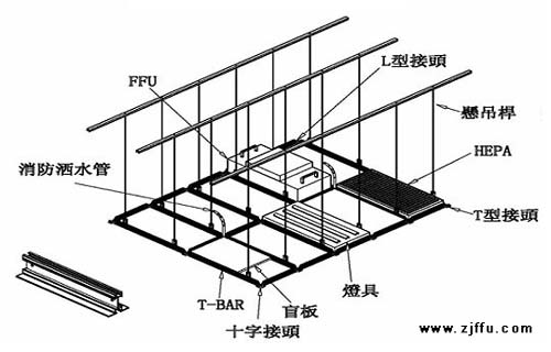 FFU風(fēng)機(jī)吊頂龍骨系統(tǒng)是指用鋁合金做成的,用于潔凈室天花吊頂?shù)闹鞑牧希ㄟ^螺桿與鋁合金相接,用來固定FFU。適用于局部層流系統(tǒng)、FFU系統(tǒng)和不同潔凈級(jí)別的空氣凈化系統(tǒng)。