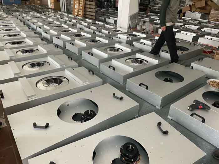 FFU風(fēng)機(jī)過(guò)濾單元的三大組成部分(風(fēng)機(jī),初效,高效過(guò)濾器)FFU風(fēng)機(jī)過(guò)濾單元英文全稱為(Fan Filter Unit),中文專業(yè)用語(yǔ)為風(fēng)機(jī)過(guò)濾機(jī)組。 FFU風(fēng)機(jī)濾單元可模塊化連接使用,廣泛應(yīng)用于電子、制藥、食品、生物工程、醫(yī)療、實(shí)驗(yàn)室等應(yīng)用場(chǎng)合。FFU設(shè)有初效過(guò)濾器、高效兩級(jí)過(guò)濾網(wǎng)。風(fēng)機(jī)從FFU頂部將空氣吸入并經(jīng)初效過(guò)濾器、FFU高效過(guò)濾器過(guò)濾,過(guò)濾后的潔凈空氣在整個(gè)出風(fēng)面以0.45M/S±20%的風(fēng)速勻速送出。