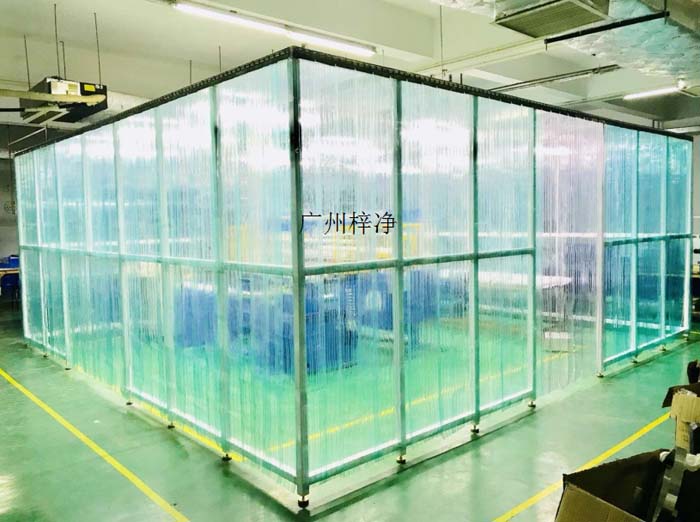 網(wǎng)格簾潔凈棚選用工業(yè)鋁材(或不銹鋼方通、鐵方通噴塑)作為框架,風(fēng)機(jī)濾網(wǎng)機(jī)組送風(fēng),四周懸掛防靜電垂簾(或鋼化玻璃),其內(nèi)部凈化級(jí)別可達(dá)到一百至一萬級(jí)。適用在操作區(qū)內(nèi)局部凈化級(jí)別要求高的范疇。